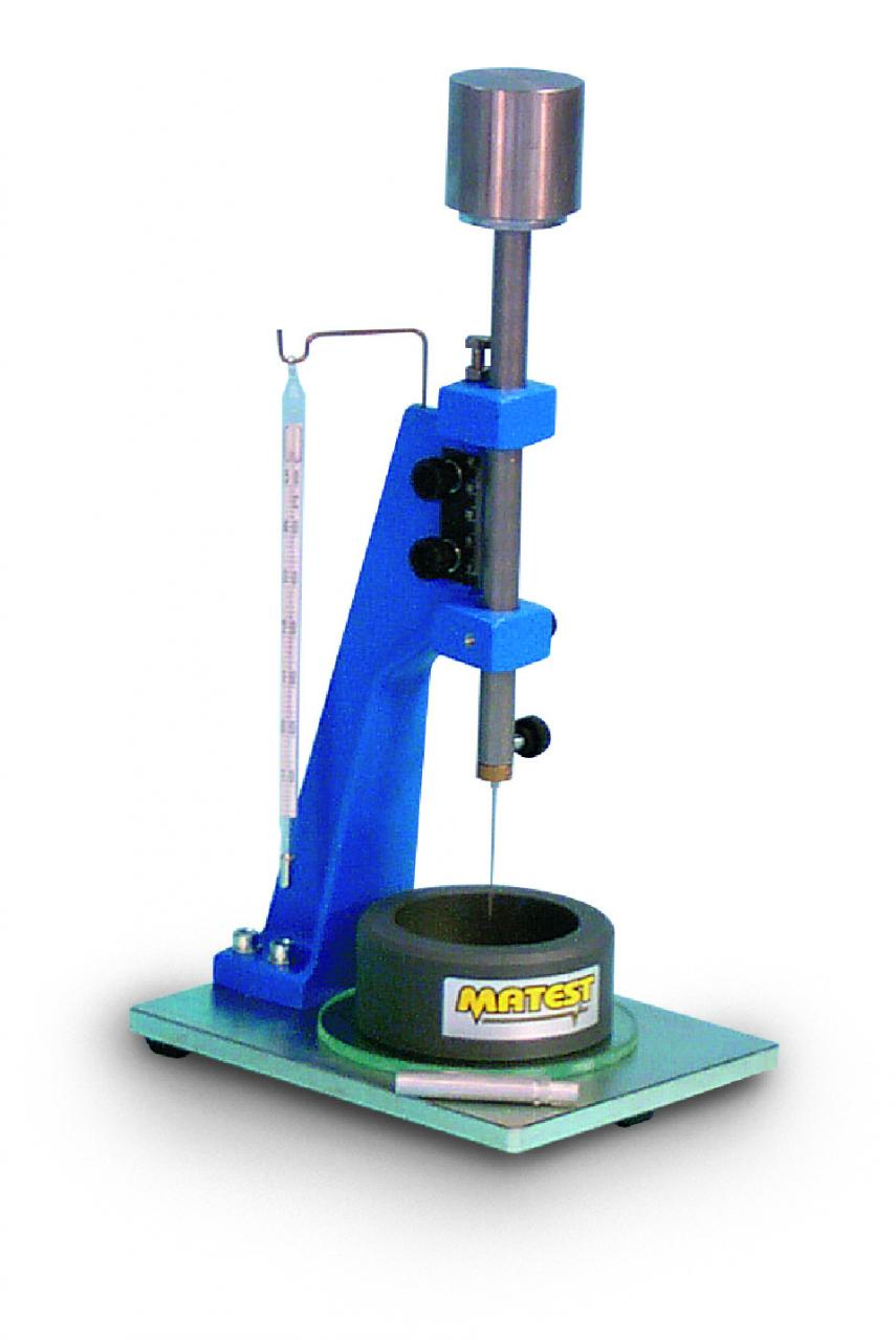 The instrument consists of a metallic frame, graduated scale with index, 300 g sliding probe, consistency plunger Ø 10 mm, and glass base plate.